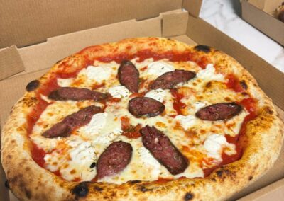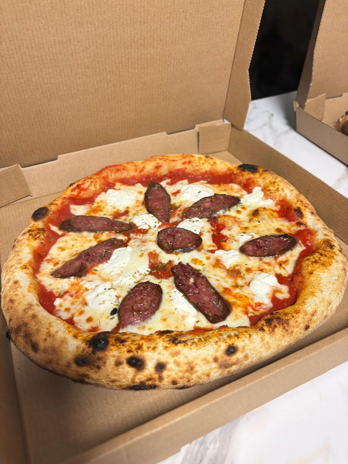 Base tomate bien parfumée, mozza fondante, chèvre frais tout en douceur et figatelli corse au caractère bien trempé 🔥